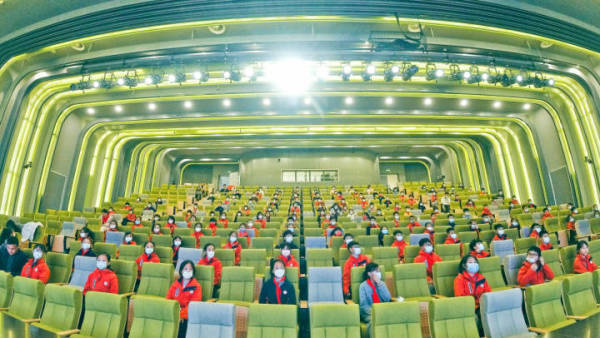 在高楼林立的都市,只要你愿意,走到窗边走出家门,依然可以享受到阳光草地,春意盎然。在奥体实验小学的未来剧场,孩子们有序隔位就坐聆听。