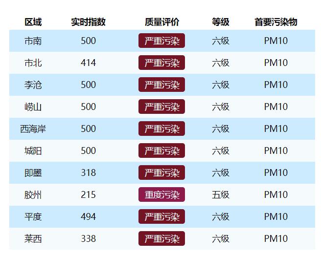 信网3月4日讯 (本网记者)据青岛市生态环境局消息,受西北地区沙尘输送影响,目前我省大部分城市空气质量降至严重污染,3月4日15时我市AQI为425,六级严重污染,首要污染物PM10。