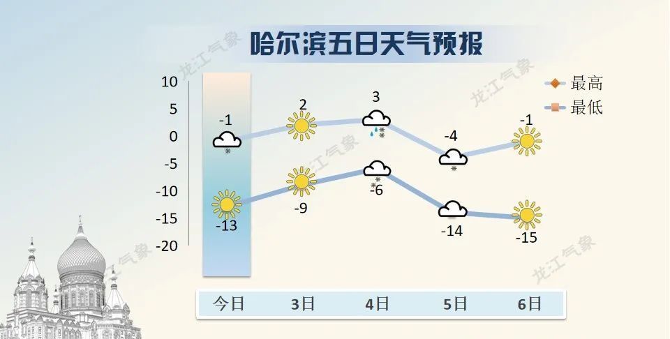 3日白天最高气温:大兴安岭北部、伊春北部、齐齐哈尔北部、绥化北部-6~-4℃,哈尔滨、鸡西0~2℃,其它地区-2~0℃。
