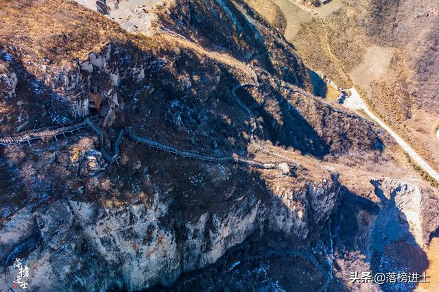 从高空俯瞰,山势还是有些险峻的,南北两条栈道连成爬山环线,大部分地势比较缓和,也有稍微陡峭的地方,需要格外小心,尤其是带老人和孩子前来。