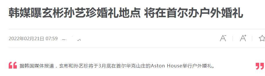 韩媒曝玄彬孙艺珍婚礼地点将在首尔办户外婚礼,玄彬和孙艺珍将于3月底在首尔华克山庄的Aston House举行户外婚礼。不过具体的时间还不太确定,有粉丝也曾表示他们将在3月16日举行婚礼。