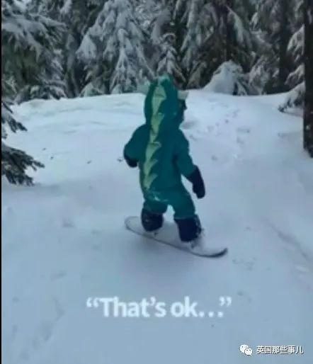 视频中,她身穿恐龙服,一边滑,一边奶声奶气得自我鼓励:也许我会摔倒,但没关系,每个人都会摔倒。